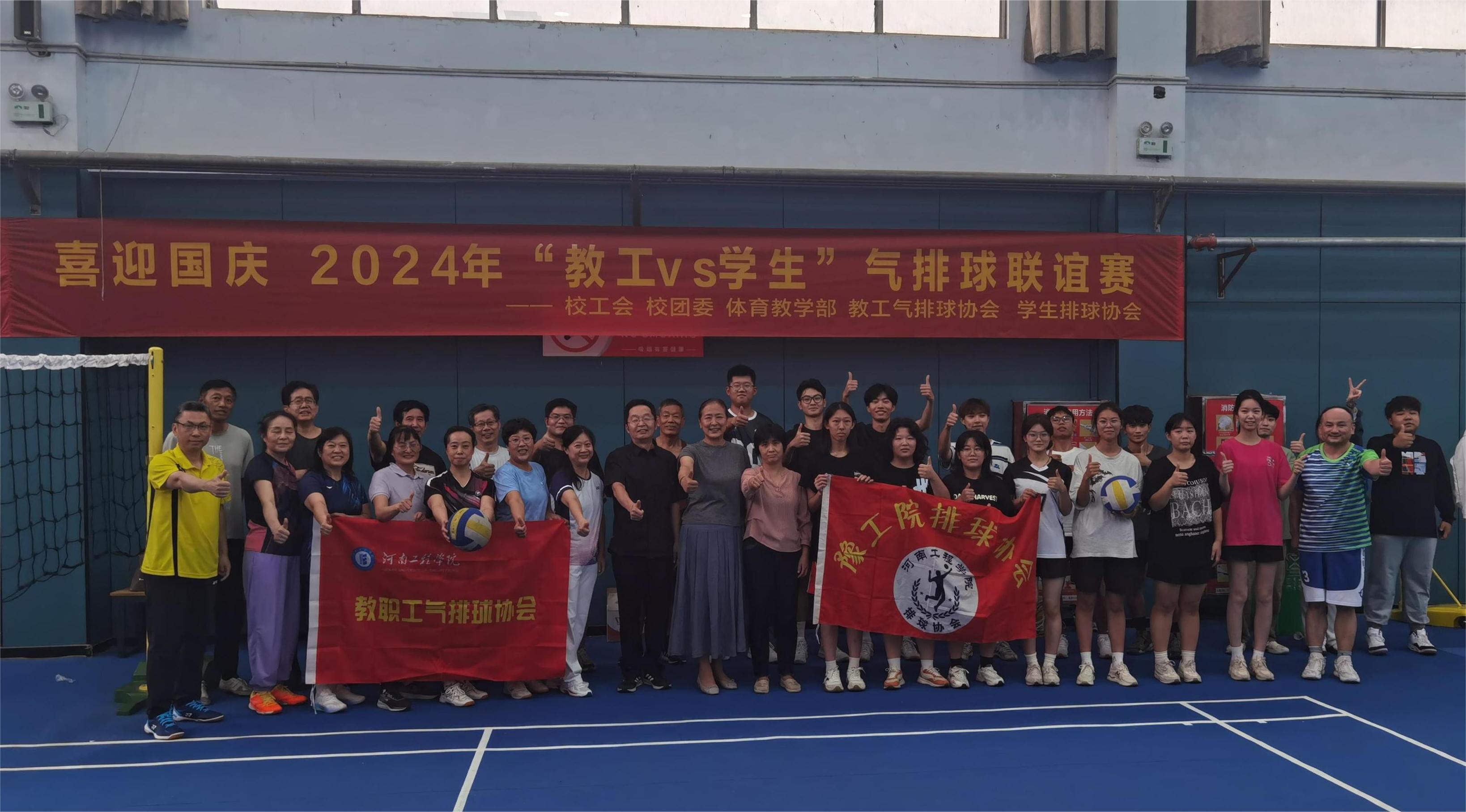 9月26日下午,在龙湖西校区体育馆,教职工气排球协会组织开展以“三全育人、五育融通、师生融乐、全面发展”为主题的“喜迎国庆 2024年‘教工VS学生’”气排球联谊赛。
